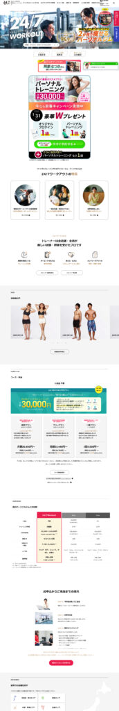 全国展開するパーソナルトレーニングジムのコーポレートサイトを制作しました。「24時間7日間、あなたをサポート」というコンセプトを、力強いデザインで表現しています。